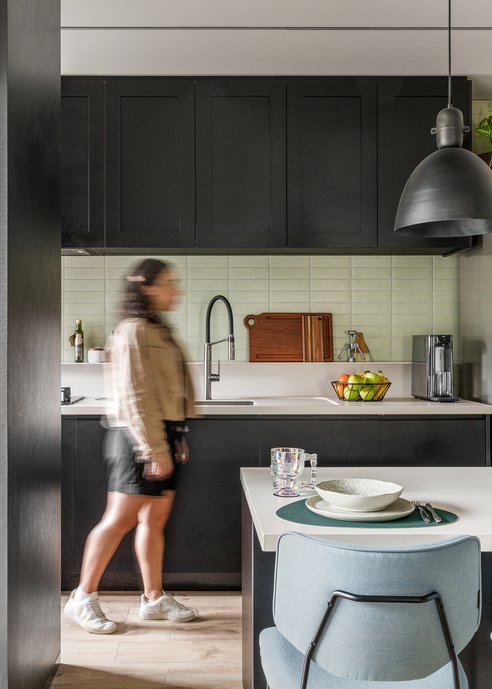 Para deixar todo o espaço mais amplo, trabalhamos a mesa/ilha com a mesma pedra da cozinha e em uma altura mais baixa, evitando assim um bloqueio muito grande e mantendo o sentar mais ergonômico. As cores também são destaque nesse lar, do preto ao branco, do azul ao verde, todos os tons se conversam e dão essa personalização ao espaço.