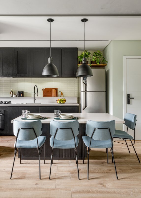 A extensa bancada da cozinha se prolonga ao longo de toda a parede e absorve no mobiliário todas as funções do dia a dia. Para mais espaço de apoio, o tanque ficou camuflado por uma tampa no mesmo material da bancada. E para uma estética mais agradável, o aquecedor e o varal ficaram escondidos. Para deixar todo o espaço mais amplo, trabalhamos a mesa/ilha com a mesma pedra da cozinha e em uma altura mais baixa, evitando assim um bloqueio muito grande e mantendo o sentar mais ergonômico. As cores também são destaque nesse lar, do preto ao branco, do azul ao verde, todos os tons se conversam e dão essa personalização ao espaço.