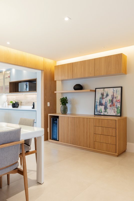 O conceito de design para este projeto baseou-se na busca por uma integração fluida e natural entre os ambientes sociais, como a sala de estar e jantar, e a cozinha. Optamos por utilizar a madeira carvalho tanto nos móveis quanto nas paredes, criando uma sensação de continuidade e aconchego. A madeira, com sua textura e tonalidade quente, trouxe uma atmosfera acolhedora, convidando os moradores e visitantes a se sentirem em casa.