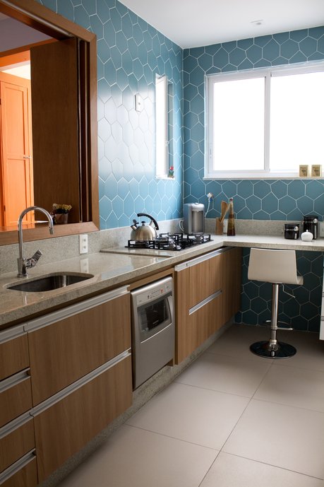 Projeto de cozinha visando integração com a sala de estar, onde especificamos os revestimentos da Portobello, sendo: piso porcelanato 60x60 Mineral Off White, nas paredes Cetim Bianco 30x60 retificado e o revestimento Bleu ST Tropez 48x48 Bold como elemento de destaque pelo seu formato irregular e também pela cor.