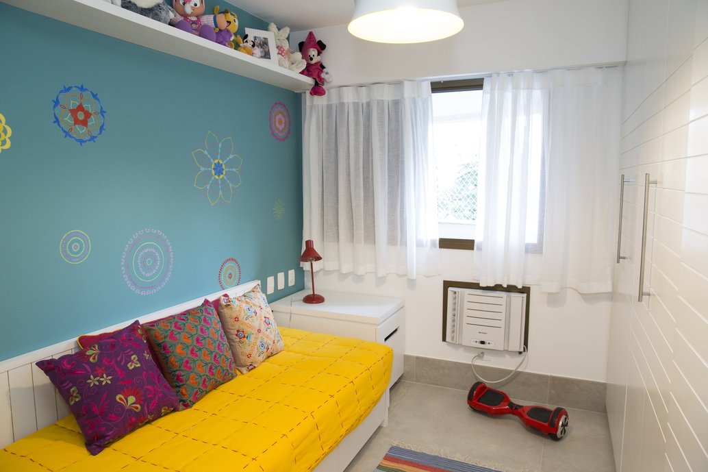 Quarto infantil e sala de apartamento. Utilizou-se o porcelanato Silos Concept 90x90, de fácil manutenção, considerando-se a presença tanto de crianças como de dois cachorrinhos de estimação. O revestimento escolhido lembra sutilmente o concreto e é considerada uma ótima escolha para os projetos contemporâneos.
