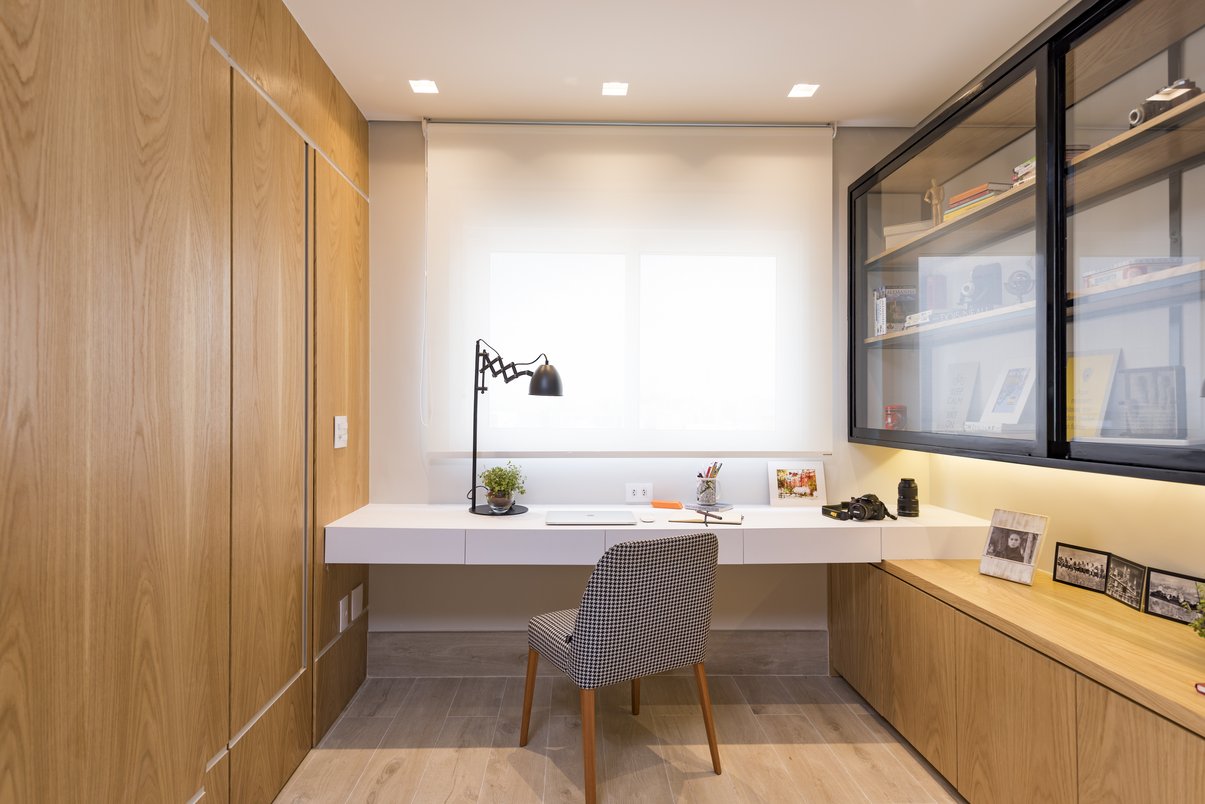 Um novo lar para um jovem pianista!! Com 70 m2, a planta original deste apartamento contemplava 2 suítes e um terraço que nós integramos com a sala para ampliar o ambiente. Projetamos um Home Office muito funcional e aconchegante onde antes era a suíte 2. Substituímos 2 paredes por painéis e portas de correr de madeira para também permitir a integração com a sala. A cor eleita para predominar foi o cinza que compôs perfeitamente com os detalhes em madeira e tons de azul e preto.