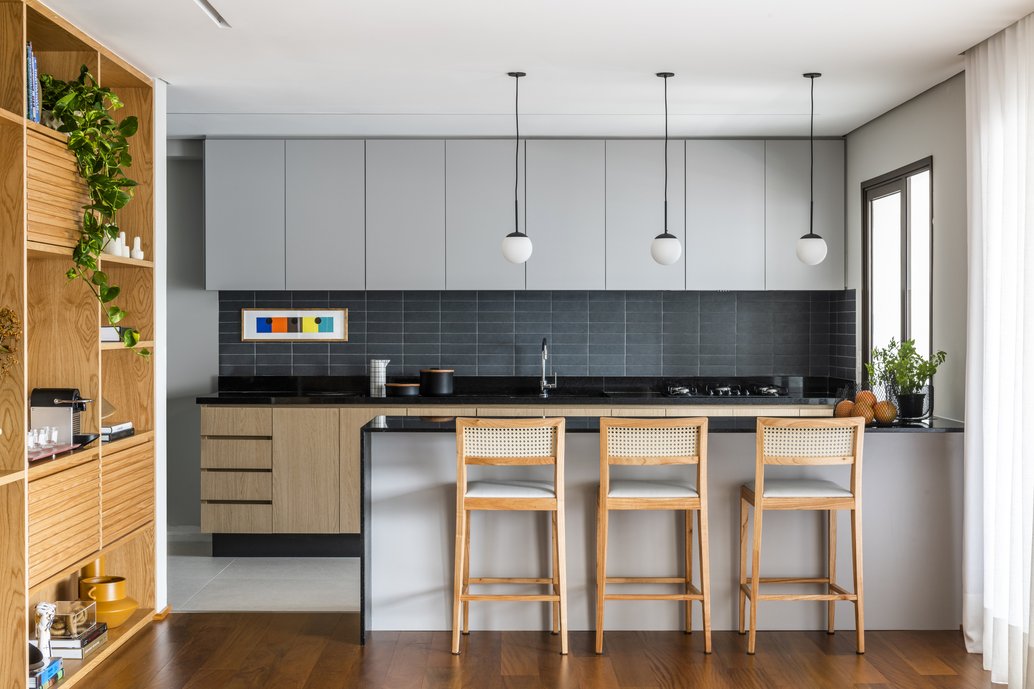 No projeto, um dos desafios foi manter alguns acabamentos entregues pela construtora, entre eles, a bancada preta da cozinha. Usando ela como base, optou-se por usar uma paleta de cores neutras nos armários superiores e nos novos revestimentos da parede e do frontão, o Horizontes New York Downtown. Fotos: Renato Navarro.