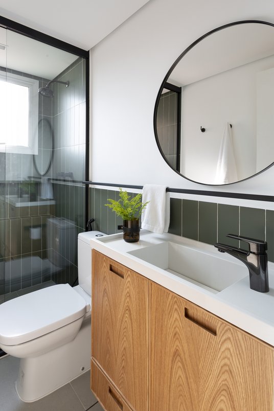 Reforma realizada no banheiro de visitas do Apto Álvares, localizado no bairro de Campo Belo na cidade de São Paulo. Tomou-se como partido o revestimento Terralma Mandacaru, que é a alma do projeto. Optou-se por utilizá-lo dentro do box e em altura de meia parede no restante do perímetro. A marcenaria em lâmina natural de madeira Freijó e os metais em acabamento preto completam o ambiente com a sofisticação necessária. Fotos: Julia Ribeiro.