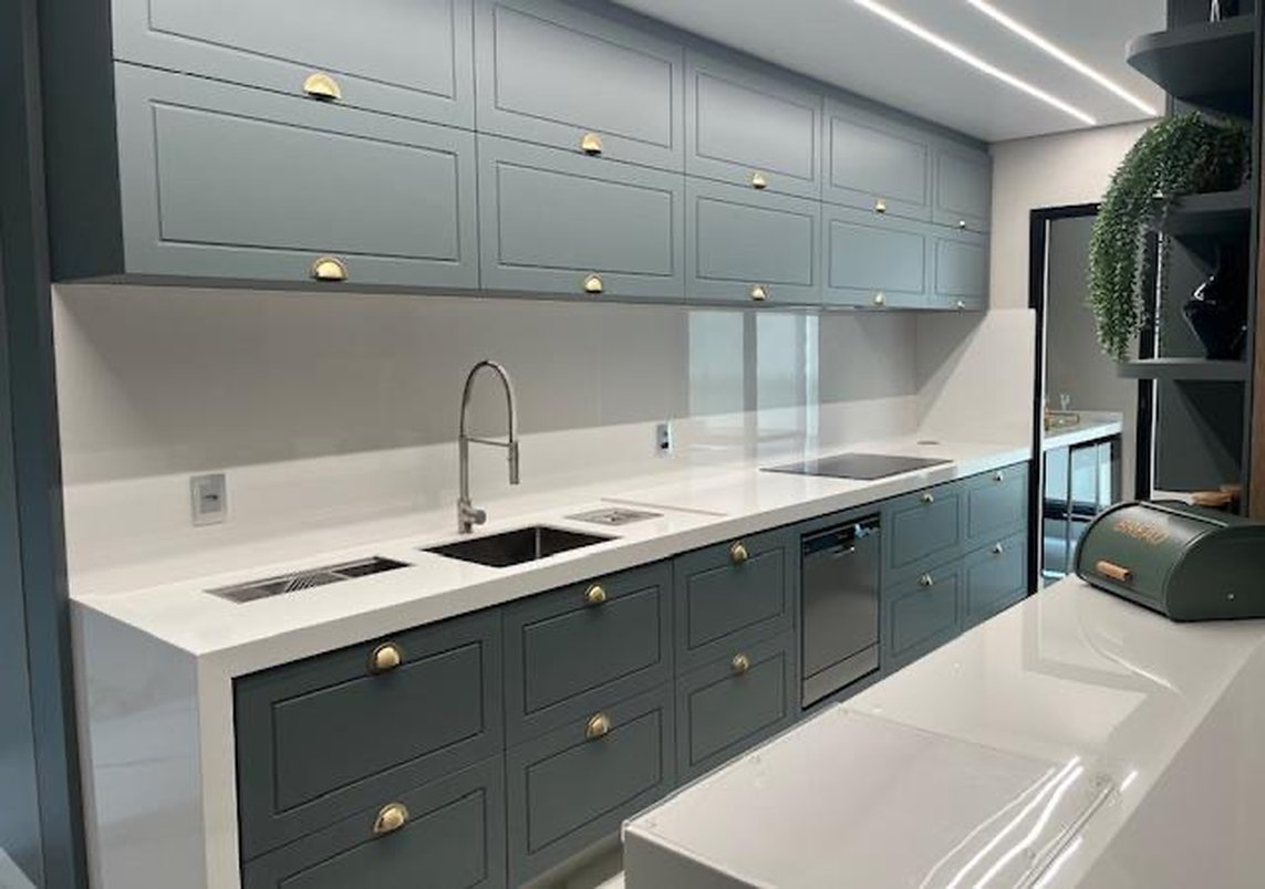 O tom suave escolhido traz leveza e modernidade, em perfeita harmonia com o piso marmorizado e a marcenaria sob medida. Os puxadores dourados complementam com um toque de requinte.