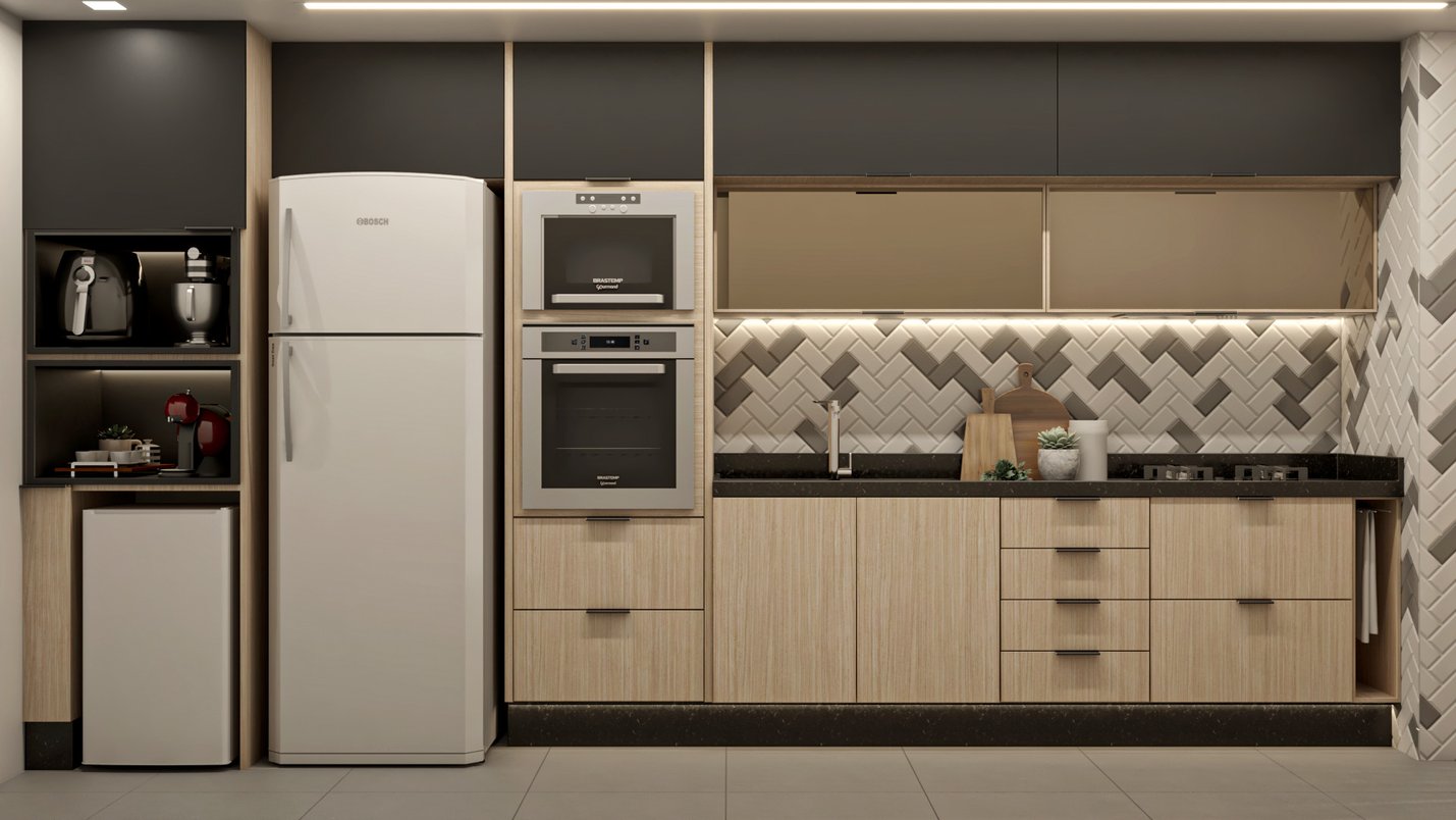 Com a intenção de trazer um toque de modernidade e um ar mais urbano para o projeto, foram escolhidos os revestimentos Liverpool White, Liverpool Concreto Aparente e para o piso o Cement Block Grey. Que em conjunto com a substituição de alguns armários se conseguiu uma sensação de amplitude e melhor circulação ao ambiente.