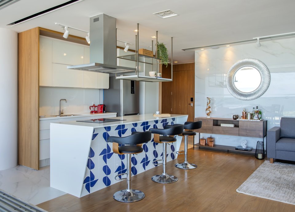 Projeto de reforma e de ambientação para um Estudio de 100m2 de frente para a praia da Barra da Tijuca. Optamos por materiais de fácil manutenção por conta da forte maresia e um lay out que permitisse desfrutar da vista deslumbrante de qualquer ponto do apartamento. Os porcelanatos, além de revestirem os piso, sobem pela parede e pelo balcão da cozinha integrada. O acabamento polido na parede criou um efeito de espelho, como se reproduzisse a areia da praia.