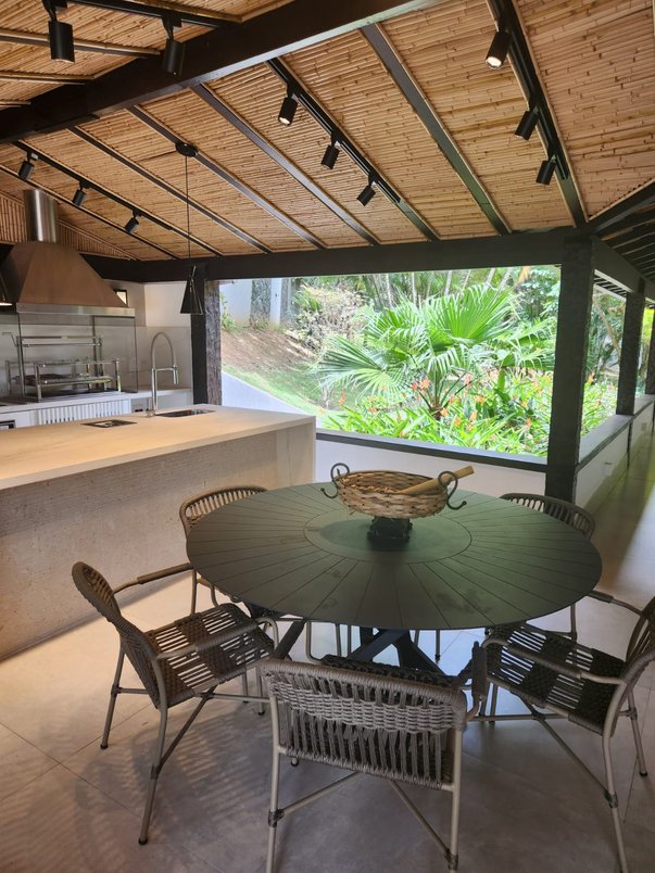 A antiga área gourmet era escura e precisava de novos eletrodomésticos. Assim, o projeto criou uma ilha onde, além da cuba e cooktop, conta com máquina de gelo.