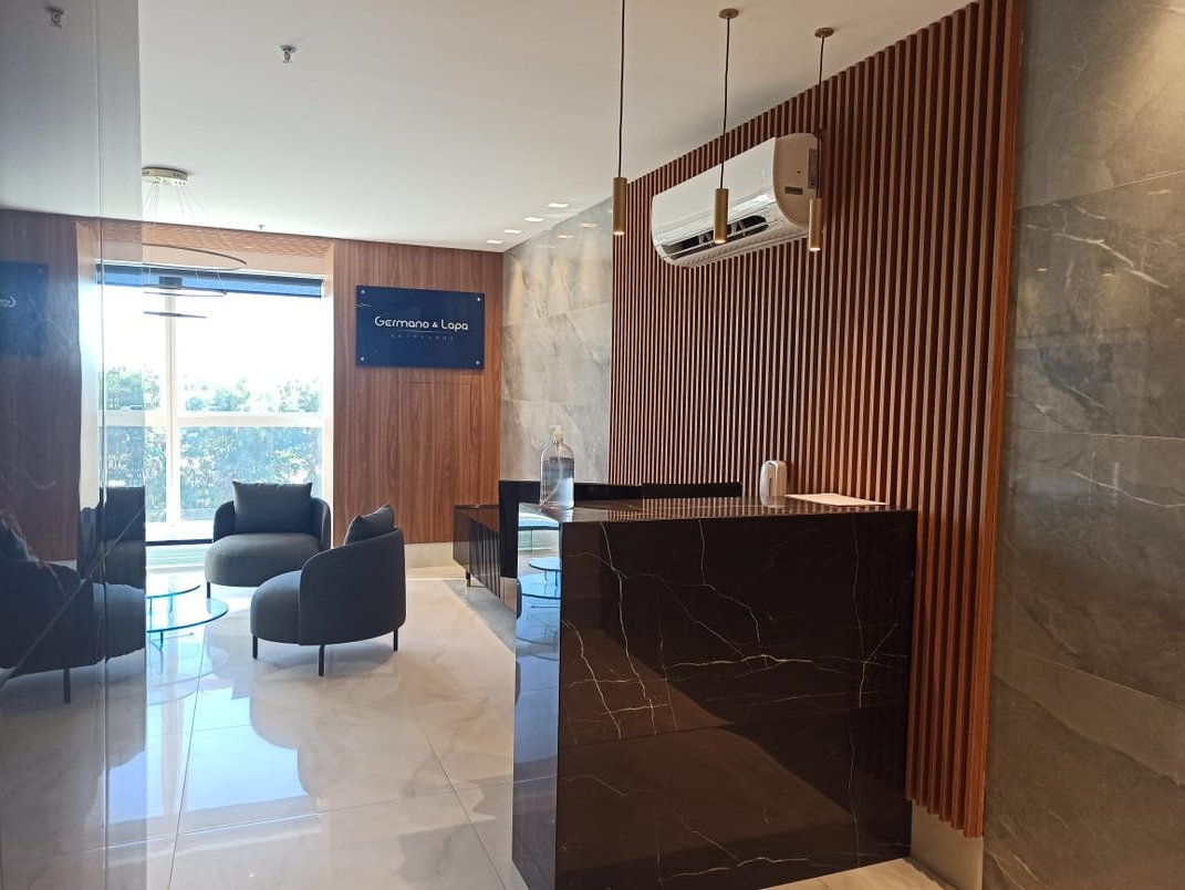 Projeto para integraçao de duas salas comerciais em um espaço único. As solicitações do cliente eram que se pudesse desfrutar da linda vista do condomínio durante as reuniões e na sala de espera. Painéis em madeira e em porcelanato foram usados para definir visualmente as áreas. O balcão da recepção foi revestido em porcelanato Nero venato , dando contraste ao piso claro.