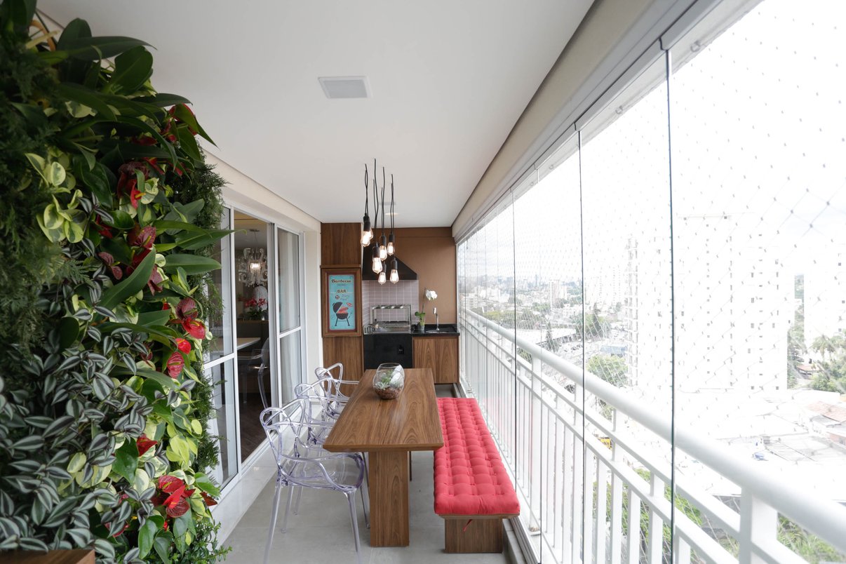Após aquisição de um novo apartamento, nos contrataram para fazer um projeto onde pudessem ali compartilhar a vida com um filho, o Rafa e planejar o segundo filho(a), sonho do casal. Desafio aceito! Foram 2 meses de projeto, 1 mês de orçamentos/planejamento e 3 meses de obra. Aproveitamos alguns dos móveis existentes, criamos outros necessários, trocamos os revestimentos dos banheiros e lavabo, aproveitamos o piso laminado. Instalamos forro de gesso na sala, abrimos a cozinha. Rafa, ganhou um quartinho novo, todo planejado para seu tamanho e sua altura. E como já tinha 3 anos, não era mais tão bebê, escolheu a decoração de CARROS, desenho que ele mais gostava. Chamamos o artista Ronaldo Cazuza para desenhar a arte das paredes, toda a mão livre! A suíte recebeu papel de parede, cabeceira, espelhos, cortina e nova iluminação. O banheiro foi todo reformado, utilizando porcelanato da Portobello tanto no piso como em todas as paredes, nicho e bancada em pedra branca, marcenaria e espelho em duas paredes. Banheiro Social foi todo reformulado, recebendo um revestimento da Portobello que traz a pedra natural para o ambiente. O lavabo, também todo reformulado, recebeu azulejo decorativo, espelho retroiluminado, bancada e cachepô em madeira. A Sala, ambiente preferido do casal, criamos dois ambientes, estar e jantar. No estar destacamos um sofá em L, tapete e pufs no centro. A sala de jantar recebeu mesa branca, banco estofado e cadeiras transparentes, junto com um lustre acrílico. As cortinas que unem os ambientes receberam destaque através da sanca iluminada. Na varanda, espaço que parecia não caber nada, conseguimos colocar uma mesa retrátil de apoio a churrasqueira, uma mesa para 6 pessoas, painel verde com rega automática e um mini-bar com adega.
