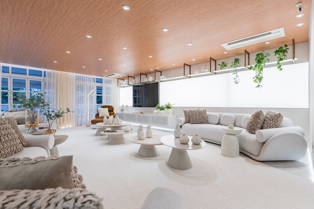 A iluminação foi pensada como protagonista: um grande painel de tensoflex, combinado ao muxarabi metálico branco, cria movimento e leveza. No bar, o quartzito Deep Blue traz a força do mar em tons de azul, cinza e dourado. O office aberto, rodeado por paisagismo, cria um diálogo delicado entre trabalho, bem-estar e natureza.