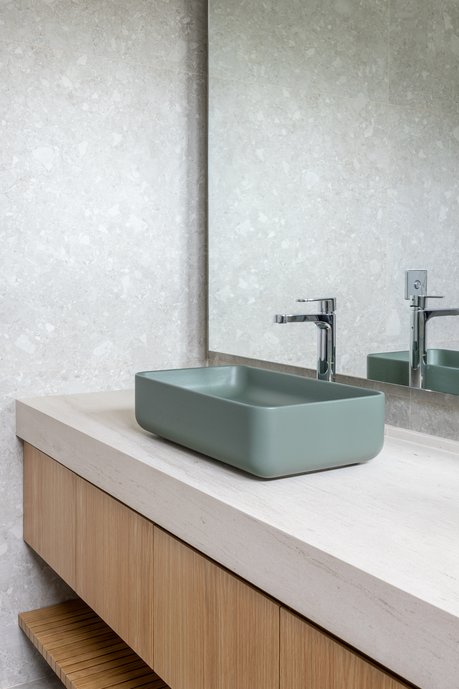 O projeto deste banheiro tem como premissa trazer harmonia e equilíbrio entre as diferentes texturas utilizadas. Nas paredes temos o porcelanato pietra lombarda off white que trouxe tons claros para o banheiro, junto ao revestimento, utilizamos o limestone para a bancada que entrou em perfeita harmonia com o revestimento das paredes. A madeira carvalho trás sensação de conforto para o ambiente com a sua tonalidade mais quente, e para finalizar, um ponto de cor através da cuba de apoio trás vida ao banheiro.