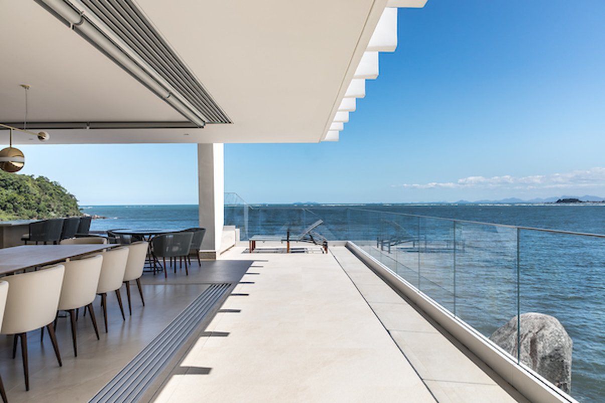 Projetada em 1965 pelo escritório Forte Gandolfi, a Casa da Pedra é destaque no litoral do Paraná. No retrofit realizado pelo escritório Arquitetare por Elaine Zanon & Claudia Machado, foi preservada a arquitetura na sua paisagem da orla. Os painéis de brise de madeira, as esquadrias minimalistas e o guarda-corpo de vidro extra clear foram importantes para valorizar a presença da vista, o mar. Fotos: Eduardo Macarios. A leveza do branco foi mantida na proposta de interiores, seguida na cozinha e na bancada toda branca, como também os revestimentos da Portobello.