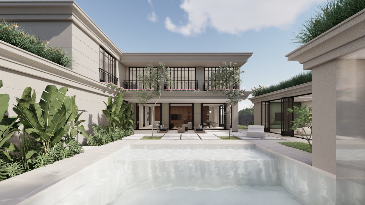 A residência, distribuída em dois pavimentos, prioriza os ambientes sociais no térreo, enquanto o piso superior acomoda cinco suítes, criando uma disposição que equilibra conforto, privacidade e convivência.