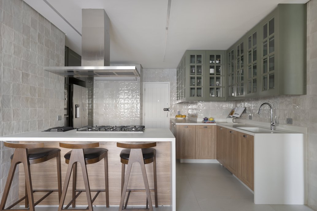Optamos por uma paleta neutra com destaque para a marcenaria em tons verdes que combina perfeitamente com a madeira, além das bancadas brancas em Corian que são super funcionais e higiênicas. O Gouache na cor Brume é o grande destaque desta linda cozinha, que além de ampla também é super funcional para o casal que ama cozinhar e receber.