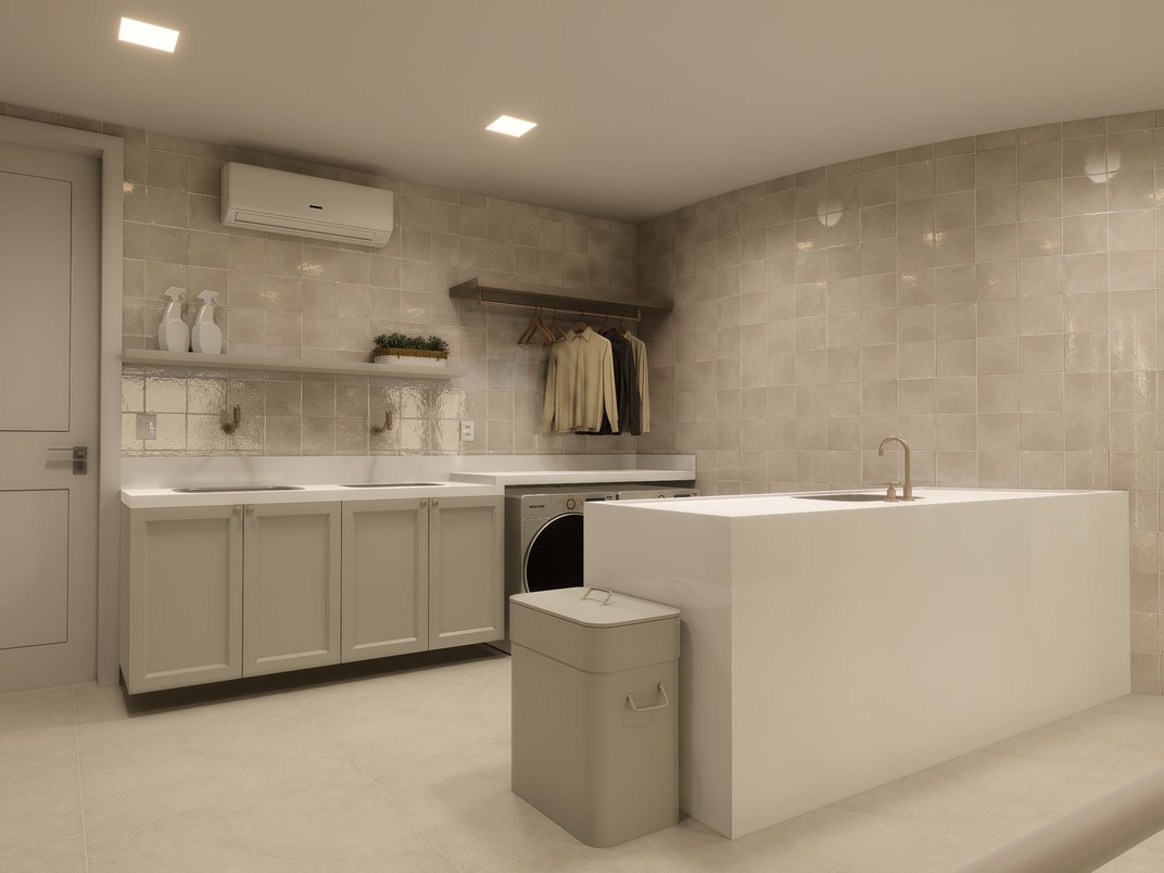 Com elementos planejados, como armários embutidos, bancada funcional, e espaço dedicado à organização e ventilação natural, este ambiente transforma as tarefas do dia a dia em momentos mais agradáveis. Além disso, a escolha do revestimento foi essencial para criar um espaço que reflete beleza, praticidade e durabilidade.