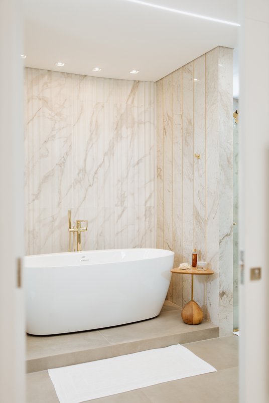 A sala de banho, foi projetada para oferecer sensação de relaxamento e spa, como um refúgio pessoal para o casal onde cada elemento foi pensado para promover o bem-estar, criando uma real experiência de spa em casa. É um espaço onde a mente e o corpo podem se rejuvenescer e se desligar do estresse do mundo exterior. As lastras em Siena chianti intercaladas com o perfil metálico dourado enalteceram a area elevada da banheira de imersão que além de cromoterapia possui o sistema air massage proporcionando uma real experiencia para o usuário.