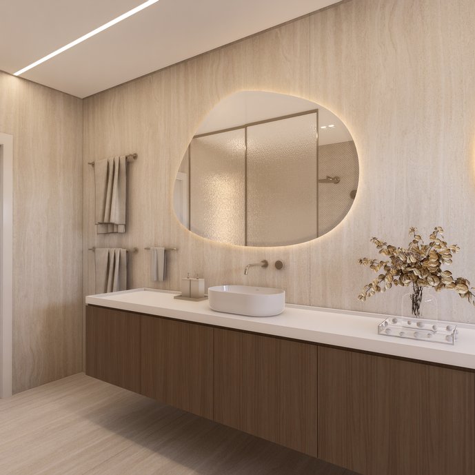 Cada detalhe do projeto foi pensado para oferecer não só beleza, mas também funcionalidade e conforto. A junção desses dois revestimentos, que se complementam de forma única, resulta em um banheiro que se torna um verdadeiro spa privado, onde a estética de alta qualidade e o bem-estar caminham lado a lado. Esse espaço é um convite à indulgência e à sensação de prazer, fazendo com que qualquer um que o veja sinta o desejo de ter um banheiro igual, um refúgio de tranquilidade e sofisticação.