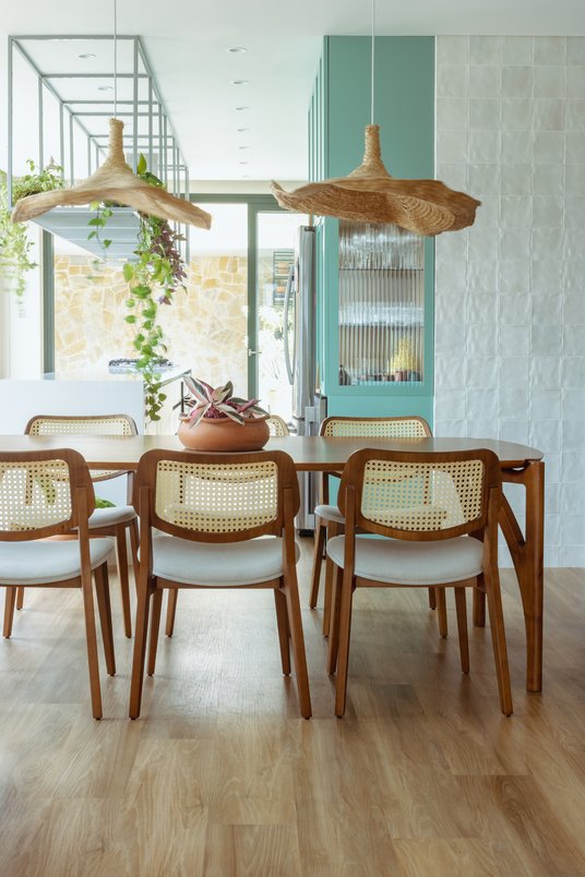 Cada ambiente foi pensado envolvendo muito cuidado e carinho. Desde a cozinha, com cores frescas e o revestimento Nuage da linha Gouache da Portobello Shop que trazem a leveza, detalhes em madeira grapia nos puxadores dos ármarios, até os cantinhos mais singelos e repletos de memórias afetuosas, como a máquina de costura herdada da avó da moradora, se conectando com a autenticidade da tapeçaria natural da Leva Oficina.