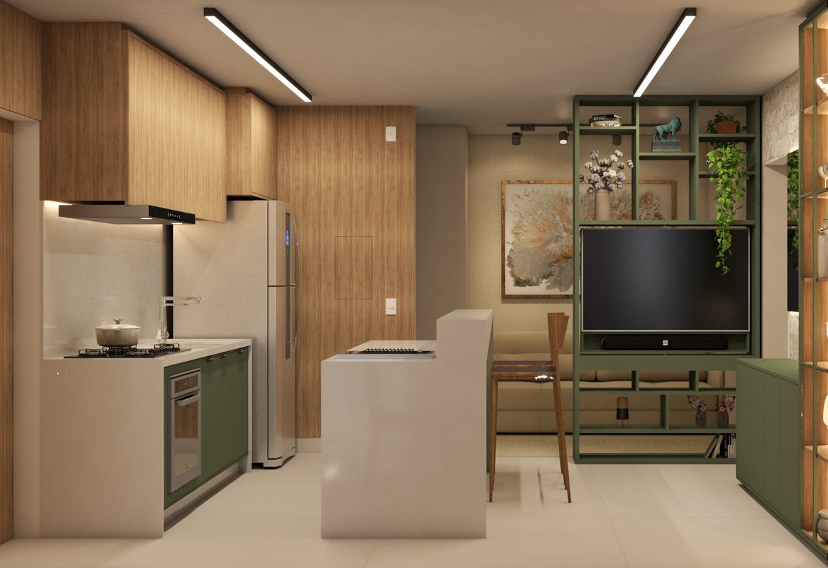 Proposta de cozinha compacta, onde o MDF na cor itapuã, o quartzo branco polido e o Cement Block Foggy, da Portobello Shop, são os grandes protagonistas do projeto. Demos um toque de cor nos armários inferiores da cozinha, para trazer mais vida ao espaço. Os clientes são apaixonados por verde, então utilizamos o MDF Verde Floresta, que casou perfeitamente com o projeto.