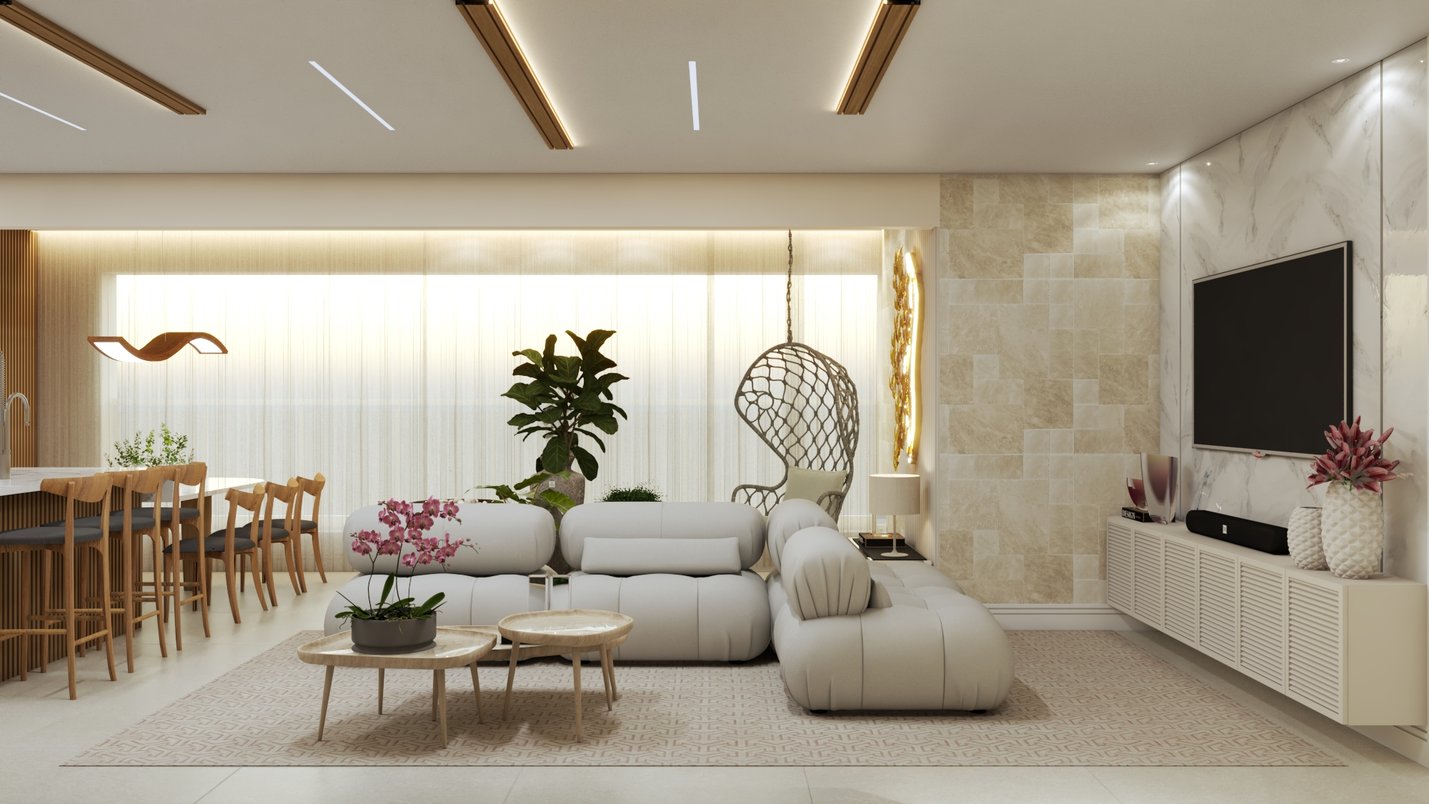 Na sala de TV com a sala de estar, utilizamos um sofá em 'L' com encosto móvel, servindo tanto para assistir um filme, quanto para socializar com os convidados. O painel da televisão será em porcelanato marmorizado, o Bianco di Elba, da Portobello Shop, e um rack suspenso para dar leveza.