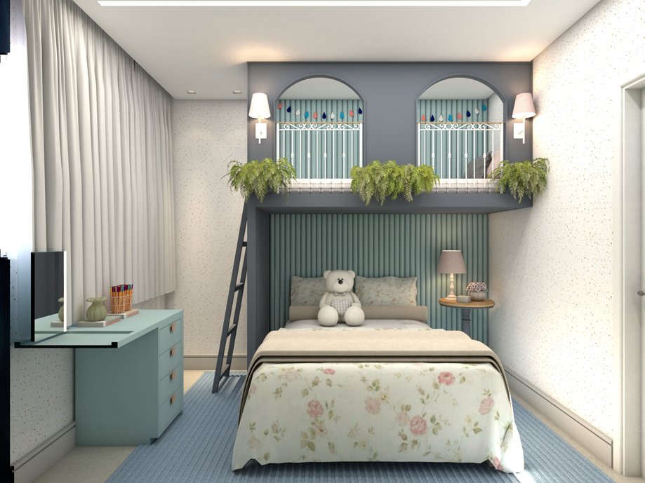 Dessa forma, colocamos uma cama de casal e criamos uma beliche no estilo "Juliet's Balcony", estimulando a criatividade diversão das crianças.