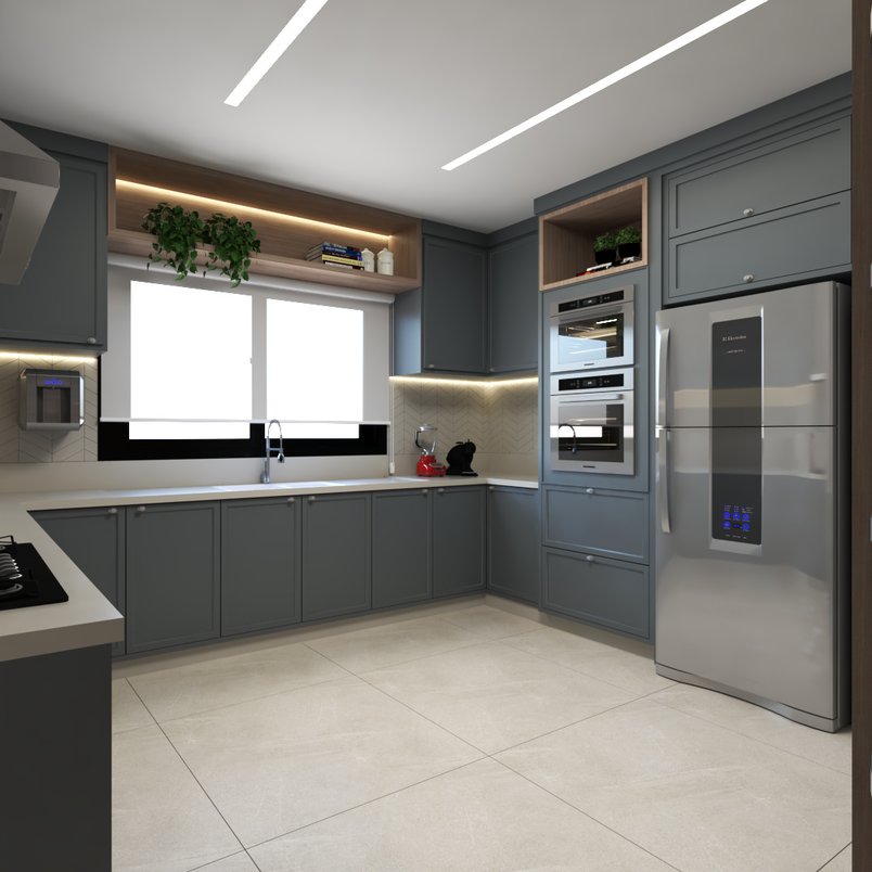 Duas propostas de cores para os armários de uma cozinha dos sonhos! Na primeira proposta, temos o MDF no 'off-white', dando um ar mais clean ao projeto. A linguagem dos armários, mescla o moderno com o neoclássico, com molduras discretas nas portas. Já na segunda proposta, seguimos o mesmo conceito de linguagem, mas em tons mais escuros. Nele a cozinha fica mais imponente e sofisticado.