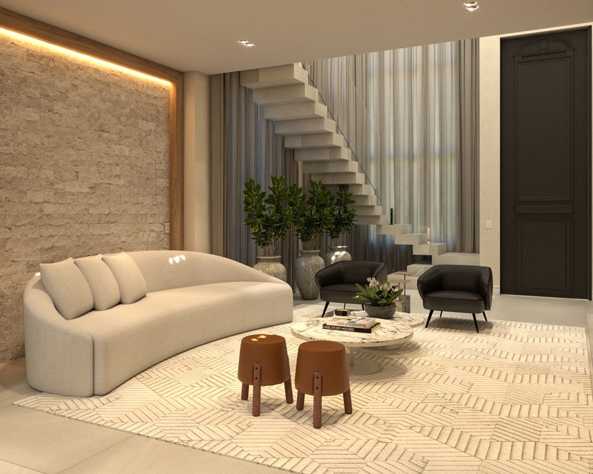 Living requintado! Neste projeto, a mistura de texturas foi empregada de forma harmônica. A madeira trouxe o aconchego e se contrapõe à neutralidade dos demais acabamentos. Dessa forma, escolhemos o clássico Ms. Barcelona Cristal, da Portobello Shop, para embelezar ainda mais o ambiente, pois em sua aparência, veios e elementos de pedras naturais, ora texturas de cimento com agregados, em um equilíbrio cromático que converge para algo único, sintético.