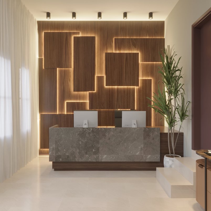 Recepção sofisticada: um ambiente que combina elegância e funcionalidade. A lâmina de madeira em acabamento glossy é a protagonista, trazendo requinte e refinamento ao espaço. O porcelanato Gray Marble, da Portobello Shop, no painel da sala de espera, é uma verdadeira obra de arte com sua tonalidade acinzentada e veios brancos deslumbrantes. O balcão e o painel criam um elo visual, estabelecendo uma comunicação harmoniosa entre a recepção e a área de espera. Um ambiente que transmite profissionalismo, conforto e confiança aos clientes.