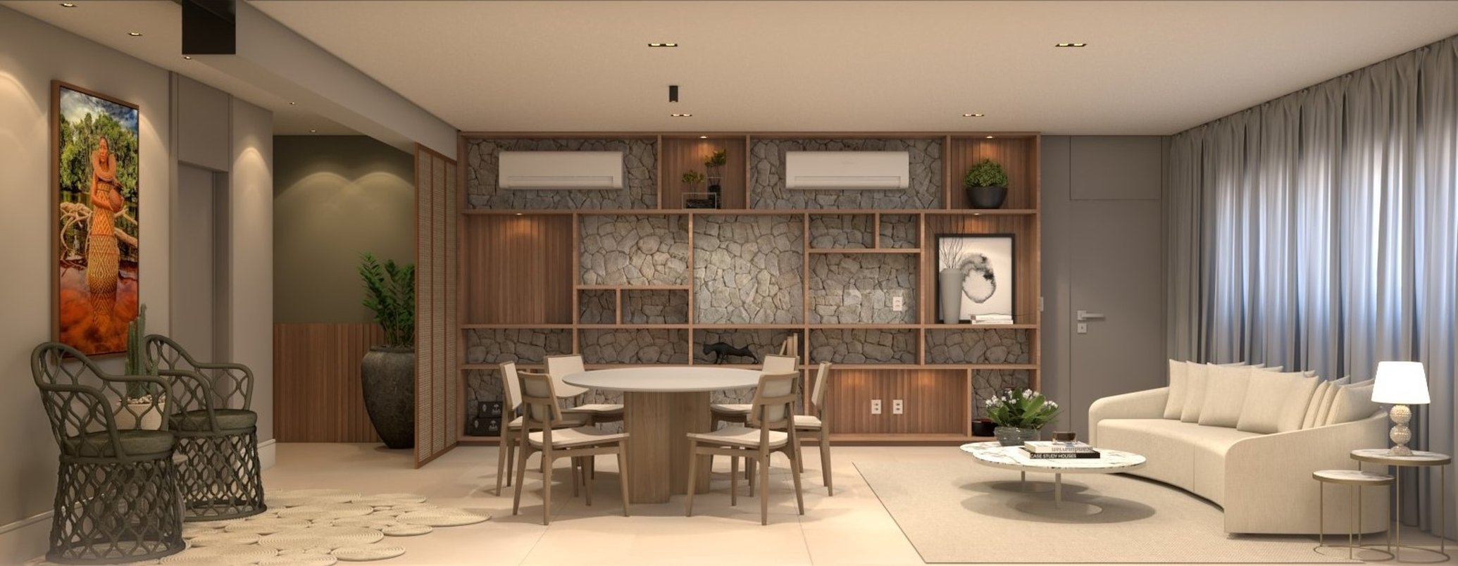 Em todo o piso, optamos pelo Via Durini Fog, pois a delicadeza da superfície equilibra a força do material e renova as opções para ambientes internos.