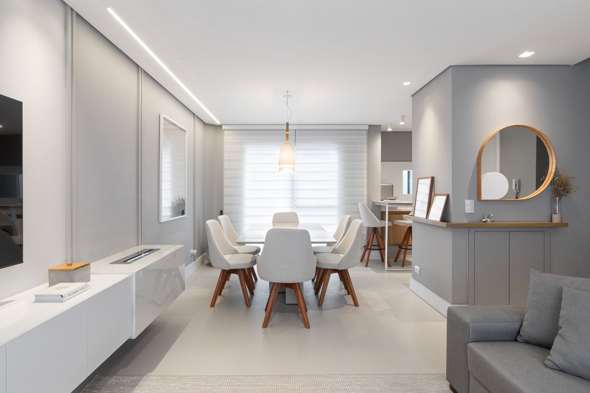 Volume da lareira feita com porcelanato Bianco Covelano 60x120cm polido Fotógrafo Matheus Kaplun