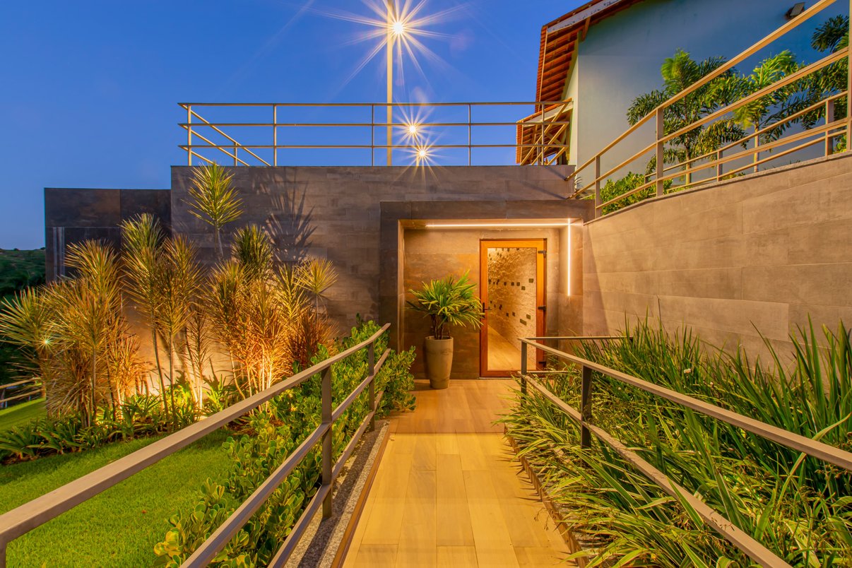 Desafio lançado, a proposta buscou um corte no terreno em declive, onde encaixamos as 4 suítes abaixo do nível de visão da suíte máster, e criamos uma praça ajardinada encima delas para poder ter acesso a essa paisagem.