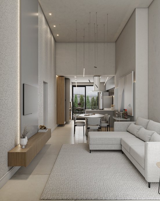 Uma residência minimalista e atemporal, pensada para valorizar a simplicidade e a pureza das linhas retas. Cada detalhe reflete a escolha dos clientes por um espaço sem excessos, onde a iluminação natural e artificial, se tornam protagonistas, ressaltando a arquitetura e criando atmosferas únicas em cada ambiente!