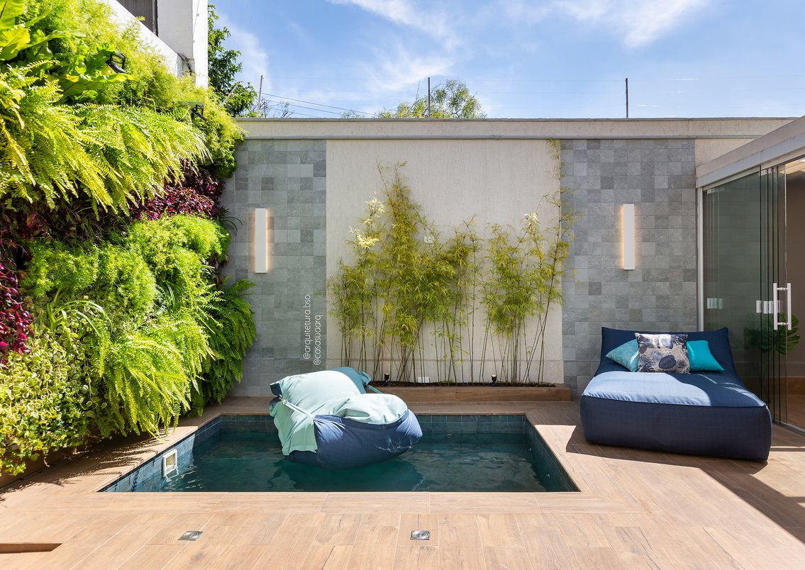 O casal de moradores precisava dar um up na área externa da casa e, assim, curtir mais o espaço e receber ainda melhor seus convidados. Acabamentos que rementem aos materiais naturais, como pedra e madeira, complementados pelo jardim vertical e pelas arandelas, deixaram o ambiente mais aconchegante e convidativo . Projeto Casa Sua + BSO . Fotos Luiz Franco