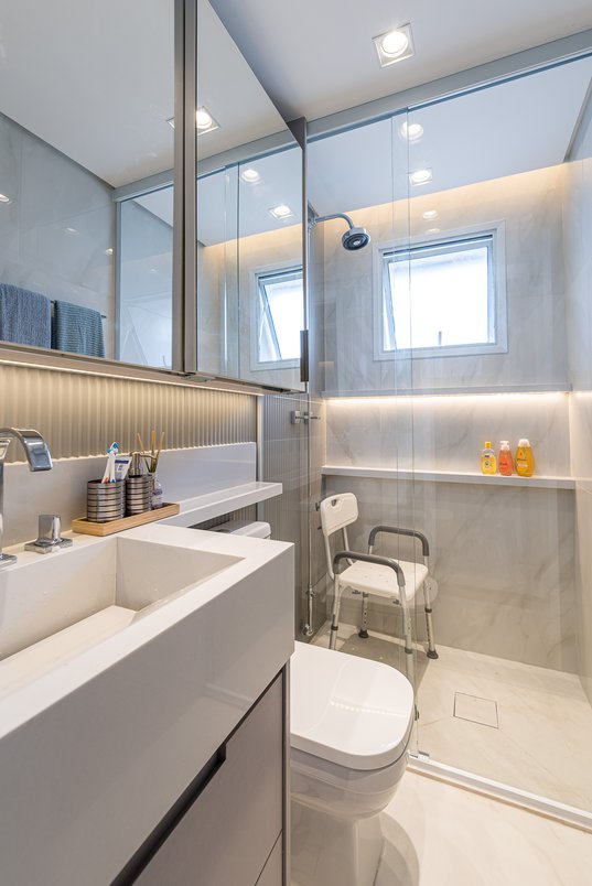 Para o banheiro compacto deste apartamento, usamos o cinza de forma leve e sem sobrecarregar, em detalhes como o revestimento Zig Zag, na marcenaria e nos veios sutis do porcelanato Bianco Covelano.