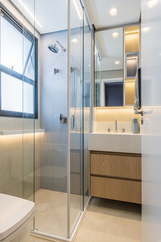 Possui prateleira em quartzo para porta shampoo, gaveta para roupas sujas, armário espelho para produtos e nichos decorativos.