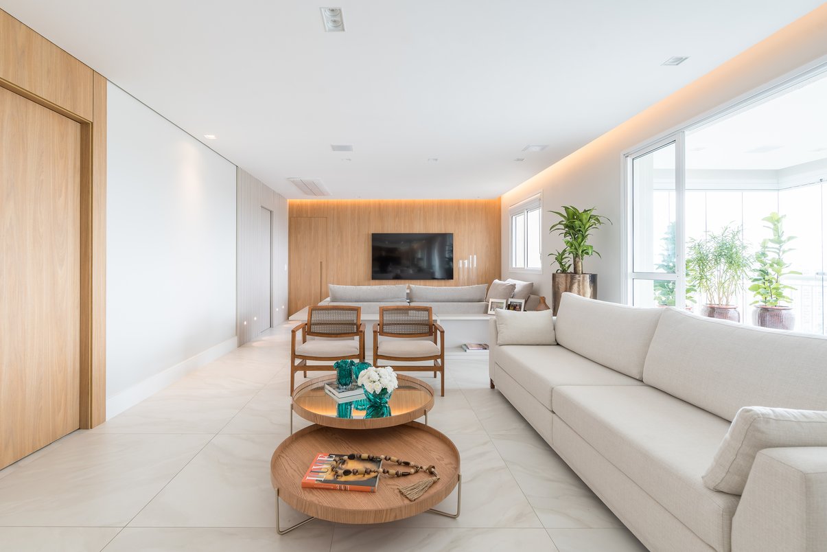 Neste apartamento do Morumbi, o Living é amplo e integra ambientes sociais de Estar e TV.