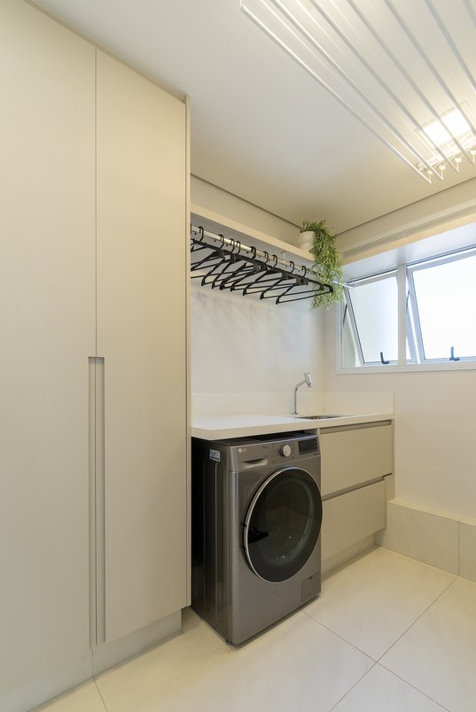 Mesmo sendo um ambiente de apoio, a Área de Serviço requer muita atenção e por que não, mais design? O mesmo piso da área social do apto adentra o ambiente (Onyx Unique Natural), compondo com as paredes branquinhas básicas, em Cetim Bianco.