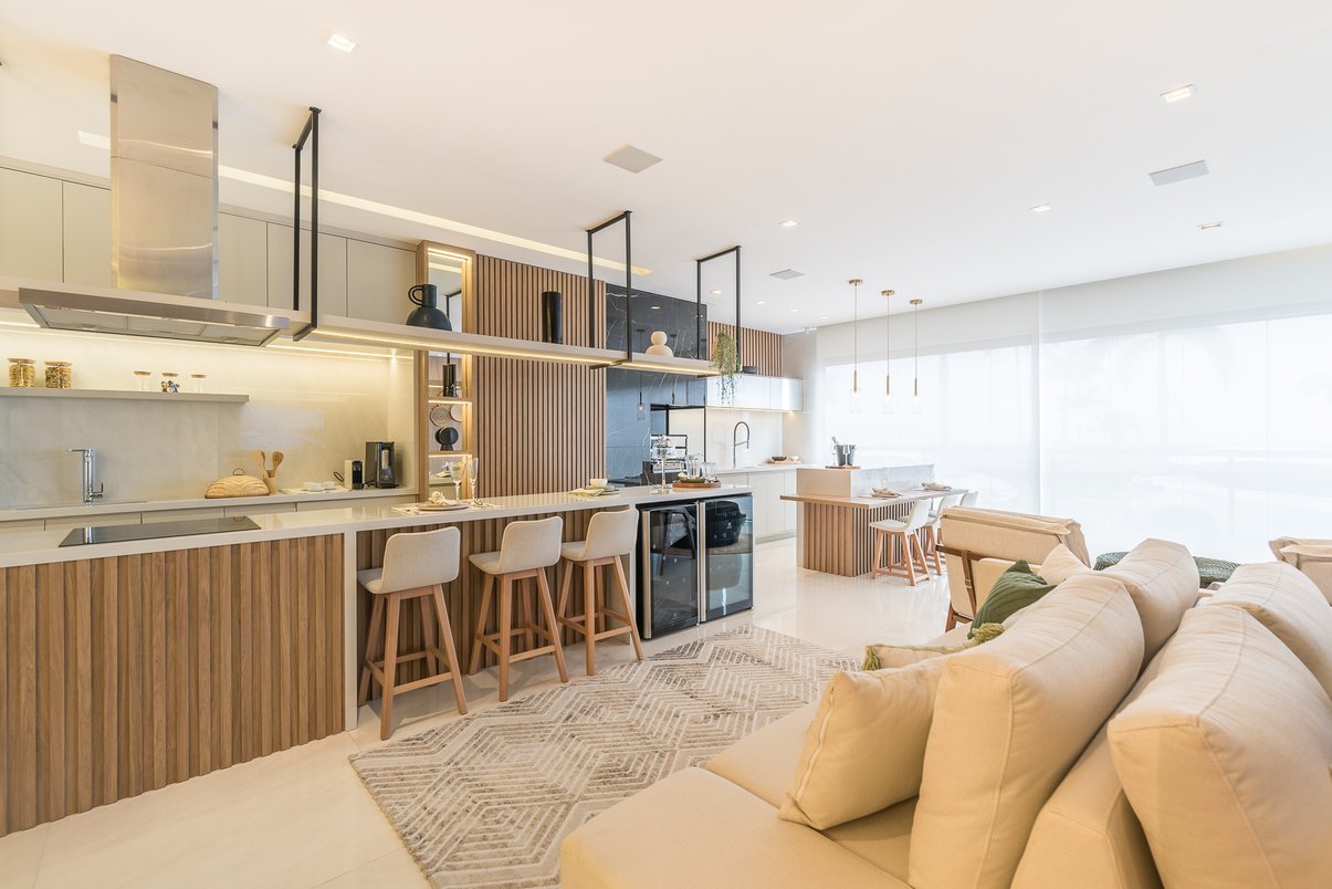 Ocultamos a Área de Serviço com porte de correr ripada, para que harmonize com a Área Social e também seja funcional.