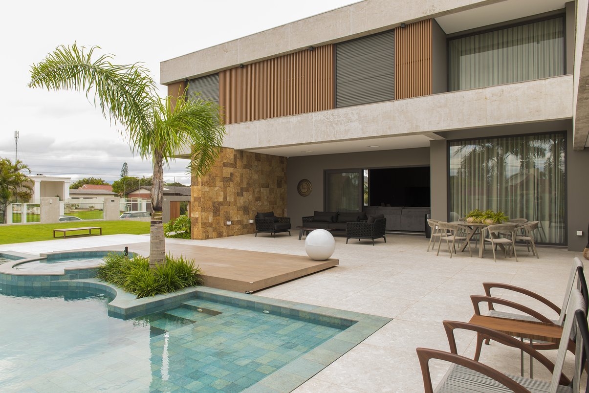 Residência contemporânea em "L" que abraça a piscina configurando uma grande área de lazer com ambientes totalmente integrados, práticos e funcionais como pede uma casa de praia. Espaço Gourmet voltado para piscina pronto para receber os amigos.