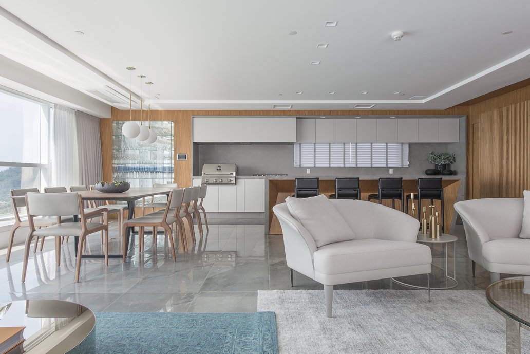 No living, porém, o cliente tem todo apoio necessário, desde uma ilha completa (adega, frigobar, cervejeira e máquina de gelo), até uma cuba com torneira escondida. Além disso, o ambiente também conta com um bar em um aparador de madeira - prático, compacto e estiloso, ele permite fácil acesso às bebidas na hora de preparar os drinks, aproveitando bem o espaço na sua forma de armazenar as garrafas, as quais complementam a decoração.