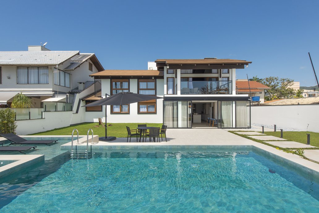 A área da piscina valoriza a conexão com a natureza através do paisagismo e vista para o mar, cuja cor azul é reproduzida nos azulejos. Ambos são contrapostos e equilibrados pela tonalidade off-white do revestimento do piso nos arredores.