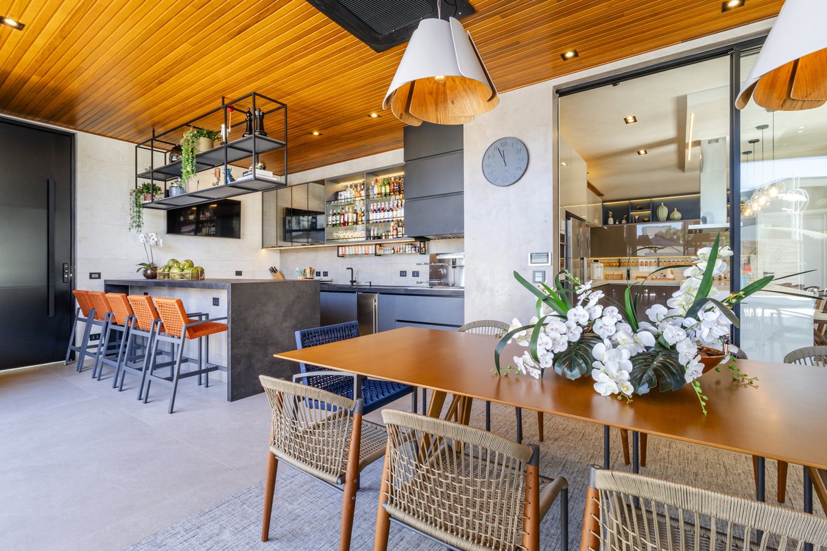 Projeto para área gourmet com estilo contemporâneo, utilizamos acabamentos cimentícios e detalhes em madeira, resultando em um espaço que combina elegância e funcionalidade. O toque de sofisticação é realçado pelo uso de brise no piso superior, enquanto os móveis para área externa garantem conforto e relaxamento. Fotógrafo: @zehcastedo