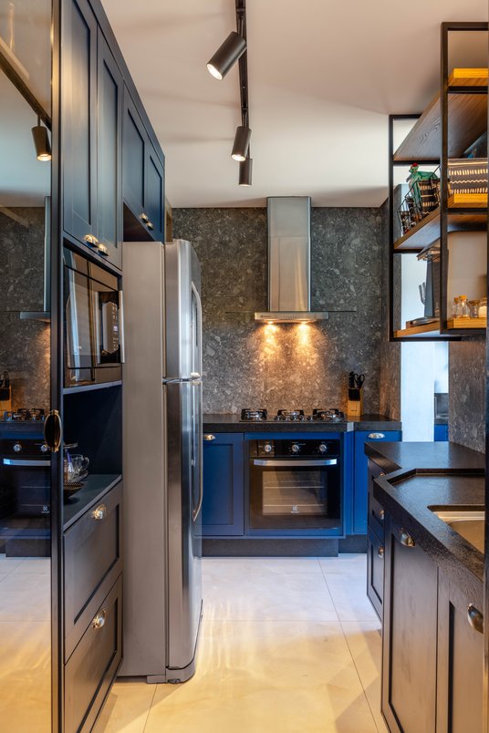 Os armários em tons amadeirados contrastam suavemente com as bancadas cinza, criando um efeito visual dinâmico e equilibrado. A iluminação estratégica, com spots e pendentes, destaca os detalhes e torna a cozinha ainda mais convidativa.