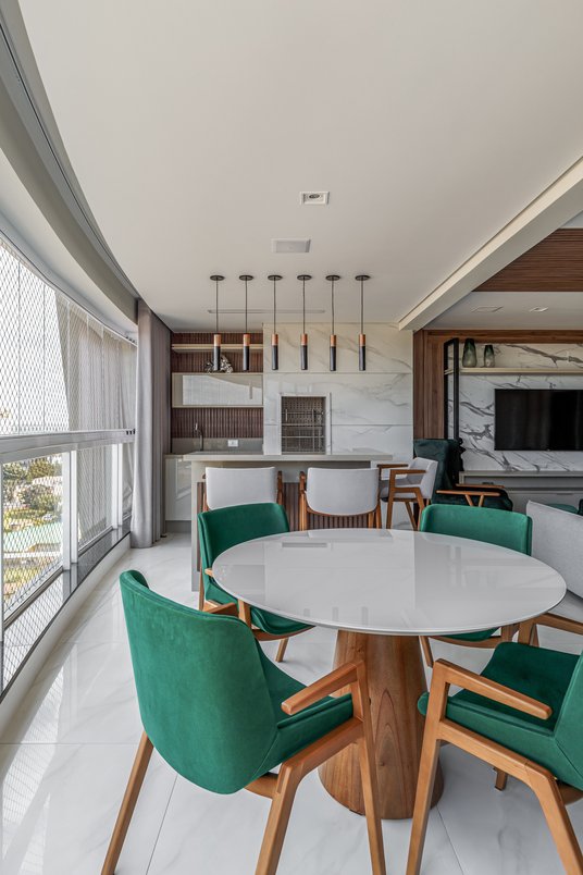 Projeto desse apartamento segue uma linha atemporal seguindo uma paleta de tons neutros que vai desde os revestimentos claros , seguido de outros com formas geométricas que trazem o aspecto de modernidade e leveza, e para quebrar a monotonia desses tons trazemos o tom verde nas poltronas em destaque.