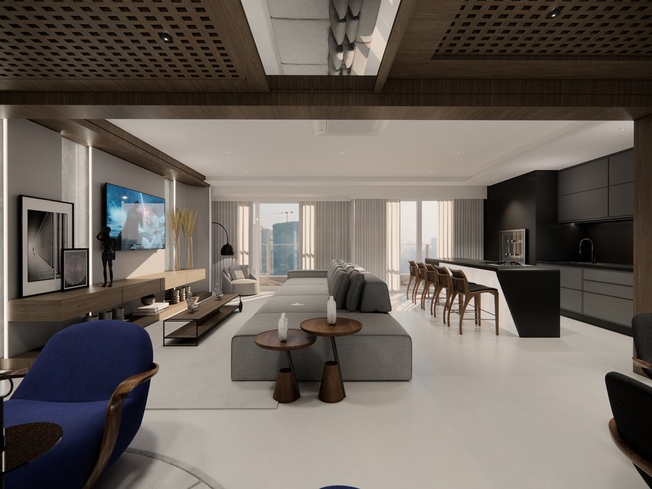 Este apartamento moderno e sofisticado é um exemplo perfeito de design contemporâneo. Ao entrar, você é imediatamente recebido por um espaço aberto que combina a sala de estar e a cozinha, criando uma atmosfera acolhedora e convidativa. As paredes são adornadas com obras de arte, enquanto a iluminação suave realça os acabamentos elegantes. O sofá espaçoso e confortável convida a momentos de relaxamento, enquanto as cadeiras de design adicionam um toque de originalidade. A cozinha, equipada com eletrodomésticos modernos, é ideal para quem gosta de cozinhar e receber amigos. A ilha central oferece um espaço perfeito para refeições informais, com cadeiras altas que complementam o ambiente. As grandes janelas proporcionam uma vista deslumbrante da cidade, permitindo a entrada de luz natural e criando uma sensação de amplitude. Este apartamento é, sem dúvida, um refúgio urbano que combina estética e funcionalidade de maneira harmoniosa.
