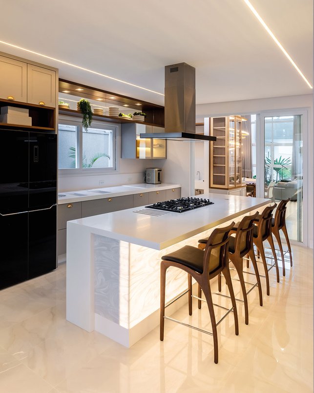 O desafio do projeto dessa casa foi de utilizar de forma inteligente o terreno que era estreito na frente e largo atrás, trazendo assim o forma de um triângulo. Já na entada da casa temos a sala de tv e jantar integradas para assim facilitar os moradores a receberem seus amigos e familiares para momentos de convívio com o máximo de conforto. Logo em seguida vem a cozinha e gourmet que acabam integrando esse espaço de maior uso para o fundo onde a piscina com sua cor azul trás o frescor para a área de lazer.