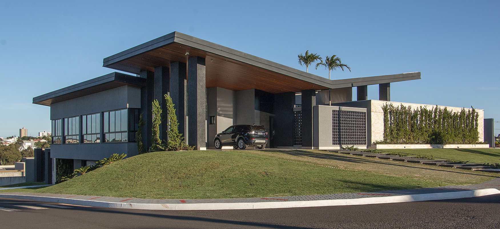 Impactante e exuberante este projeto arquitetônico para a residência localizada em um condomínio de Arapongas-PR distingue-se pela modernidade e requinte. O telhado disposto de forma invertida para criar duas grandes asas, que visualmente pousam sobre a edificação, é o destaque que inspirou o nome de Casa Wings. Acompanhando esta inusitada inclinação, o pé-direito da garagem externa e o living receberam revestimento em madeira que se estende por todo o beiral, conferindo uma atmosfera aconchegante e contribuindo para o tratamento acústico e térmico. Aproveitando o desnivelamento do terreno de esquina, o pavimento térreo segue o nível da entrada, com a ala íntima ao lado da social, que comporta os ambientes do uso diário da família. A área de lazer ocupa todo o piso inferior, garantindo a privacidade para os momentos de entretenimento e reuniões entre a família e amigos, com um elegante espaço gourmet integrado à piscina através de um bar molhado. Valorizando o estilo contemporâneo, a cor preta aparece em diversos elementos, com evidência para a utilização de esquadrias em PVC onde foi aplicado um acabamento em alumínio Titantec clicado, a fim de garantir maior durabilidade, conforto térmico e sofisticação.