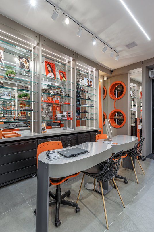 Projeto dessa ótica tem como objetivo criar um ambiente moderno e jovial para comunicar com o público jovem , tons cinzas e preto trás esse clima moderno e a cor laranja pontuada em detalhes da marcenaria e mobiliário deixa o espaço dinâmico e moderno.