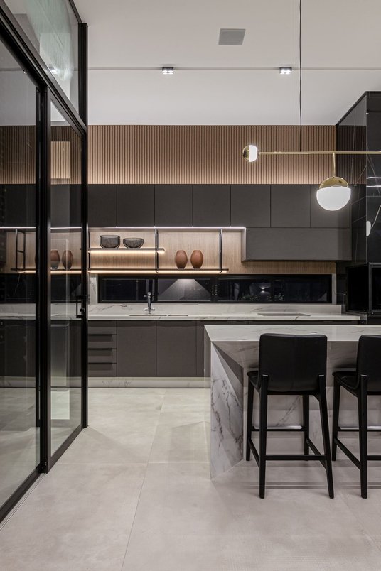 Um projeto que proporciona bem-estar e conforto à família. O contraste entre os mármores em cores claras e os móveis de cores escuras traz harmonia e elegância aos ambientes. O trabalho em vidro na escada garante o toque clean ao visual.